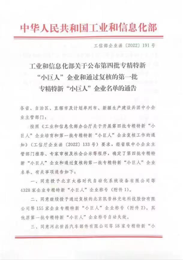 圖:工信部第四批專精特新“小巨人”企業(yè)名單通告文件