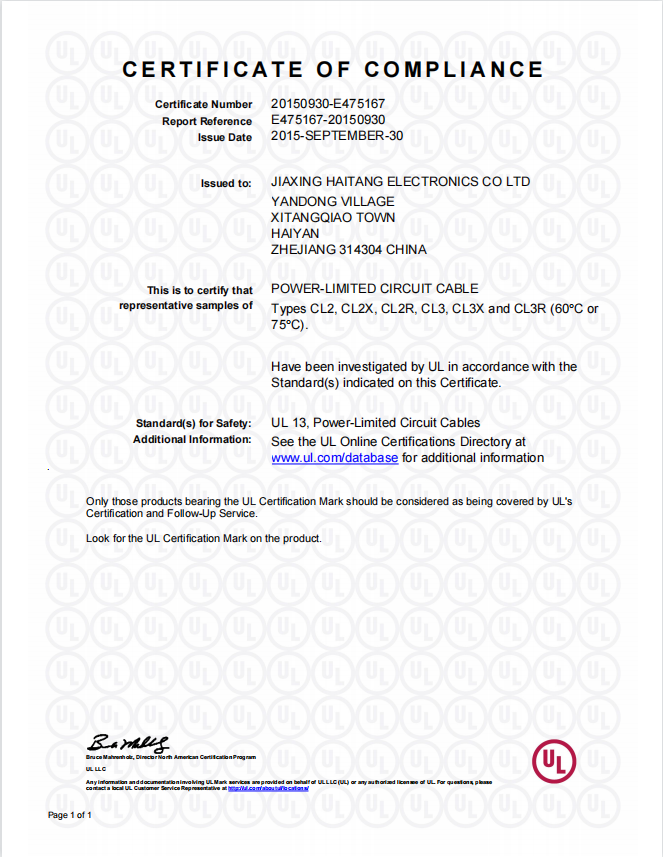 Power-Limited Fire Alarm Cable-E475170UL認證