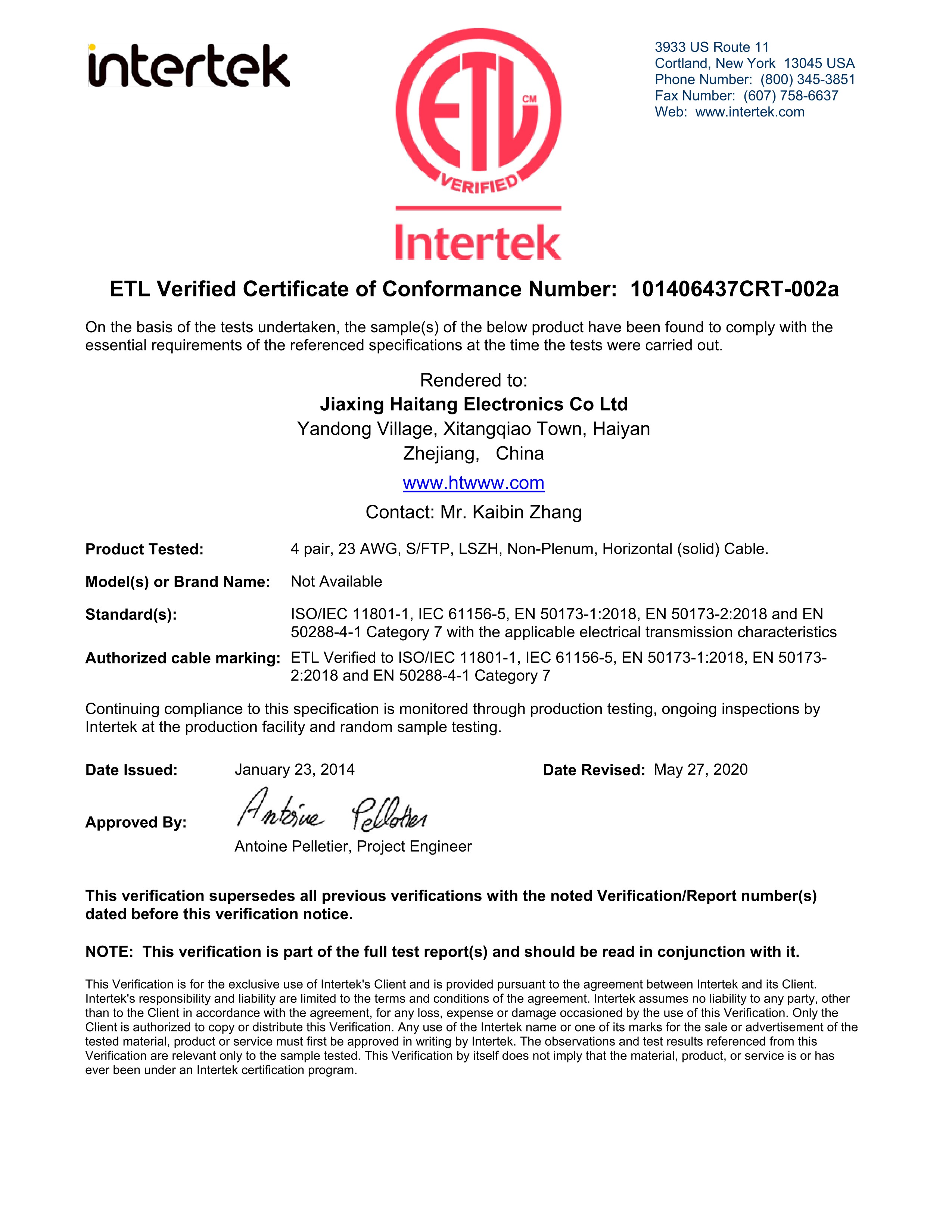 SFTP CAT7 23AWG LSZH ETL性能認(rèn)證