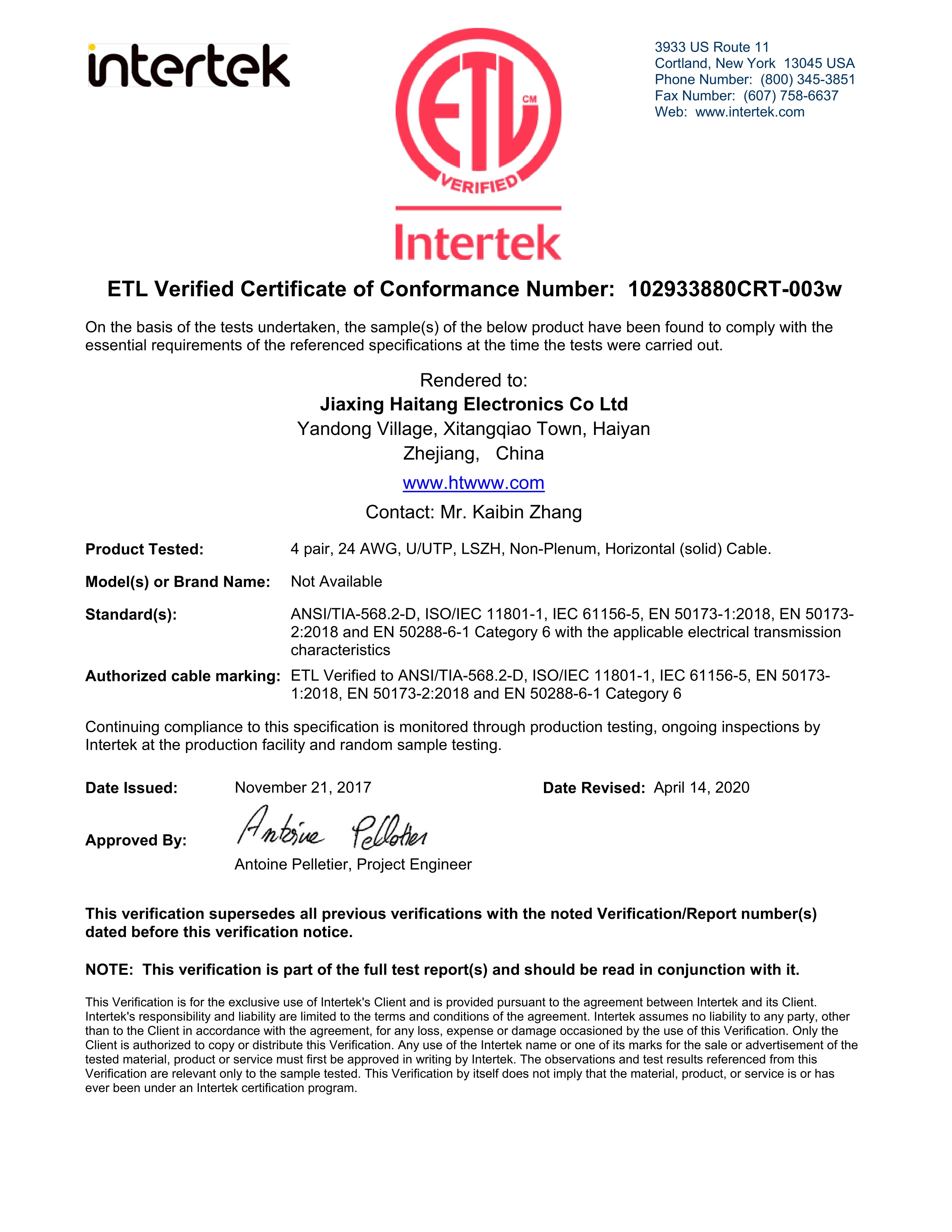 UUTP CAT6 24AWG LSZH ETL性能認(rèn)證